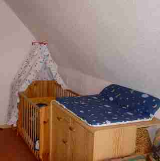 weiteren erwachsenen Person oder einem Kind eine bequeme Schlafmöglichkeit bieten. Das massive Kinderbett mit Himmel lässt die Kleinen sicherlich gut träumen. Für die ganz Kleinen gibt es einen Wickeltisch mit Auflage. |