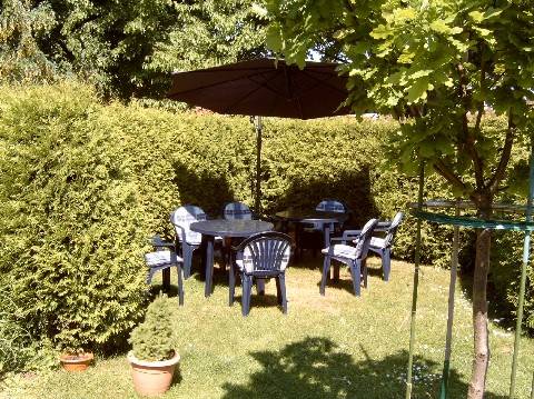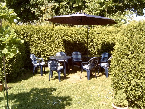 sich im Garten und ist von einer hohen Lebensbaumhecke umgeben. Natürlich